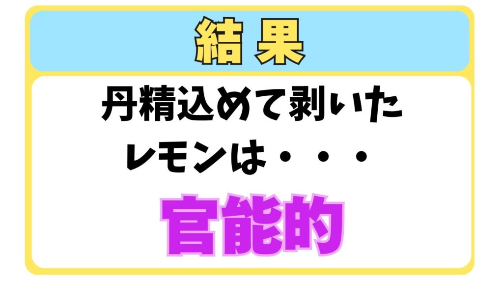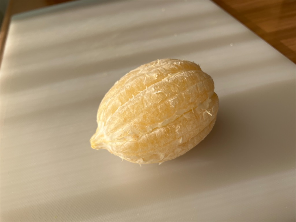 えっと、こんなレモン初めて見たな、そりゃそうか。なんというかねへへっwあーすっごいなぁこれすっっっご。紡錘形?の曲線美が、曲線美ていうのもアレか。丸ぅみを帯びていると言いますかぁ…自分で皮を剥いでこれが出てくるっていうのもね、追体験よね。もうこれを無視するのも変だから言うけども、誤解を恐れずに言うけども、なんか微エロい。あのね勘違いしてほしくないのは俺は決してこの果実に女性の胸部を見出しているわけではないのですよ。あれほどの酸味と栄養を兼ねた優等生のあなたが他の子とはちょっとだけ違うトコをここまで見せてくれますか、と。そんなつもりじゃなかったのにこっちが恥ずかしいわ