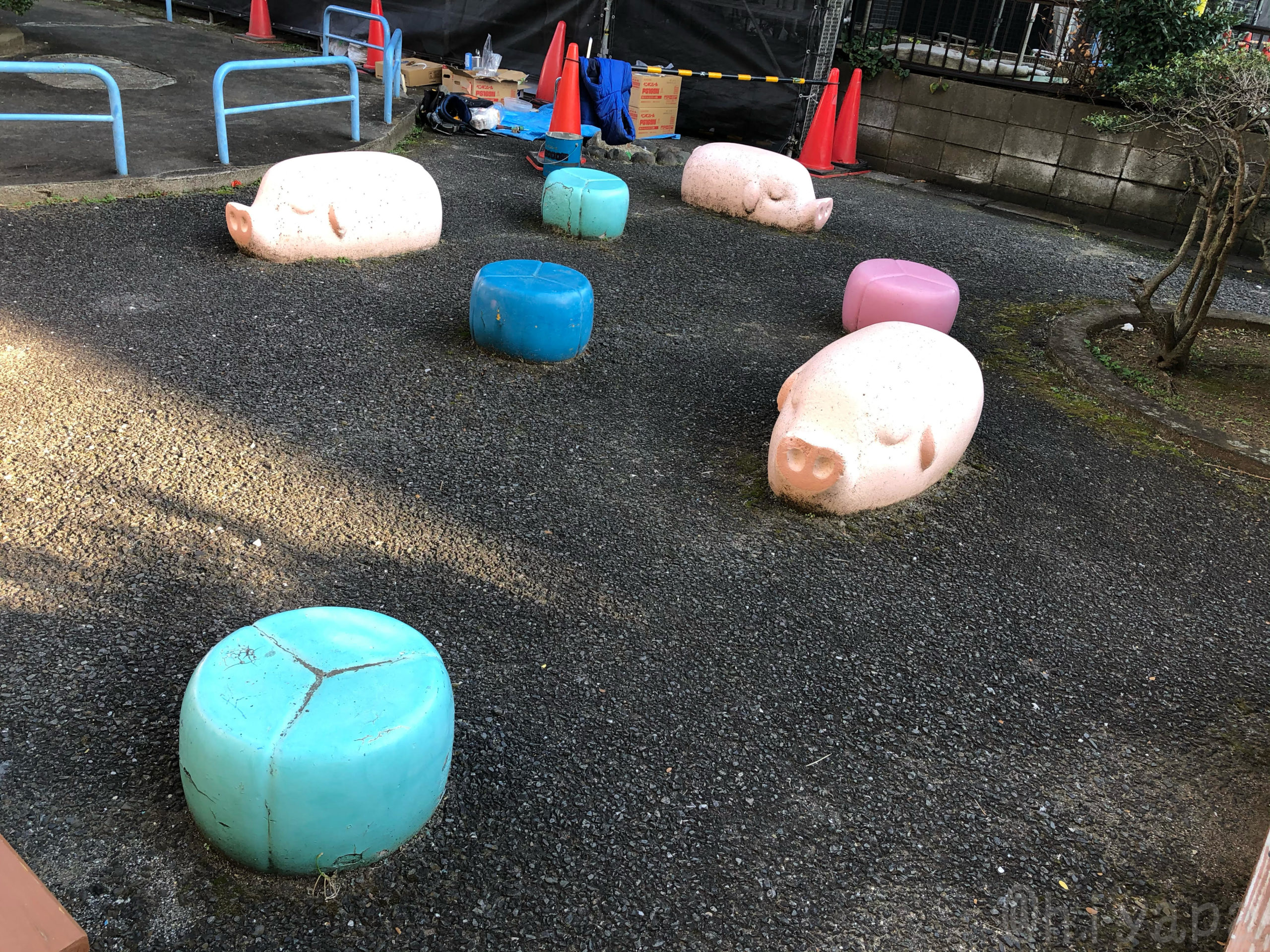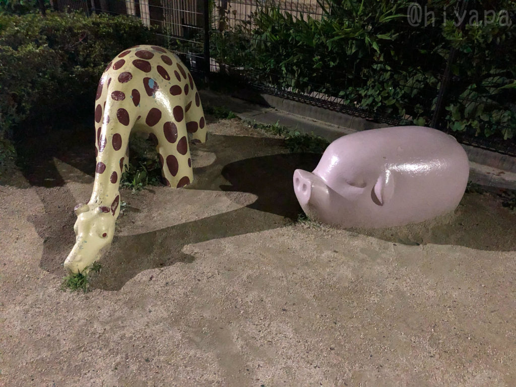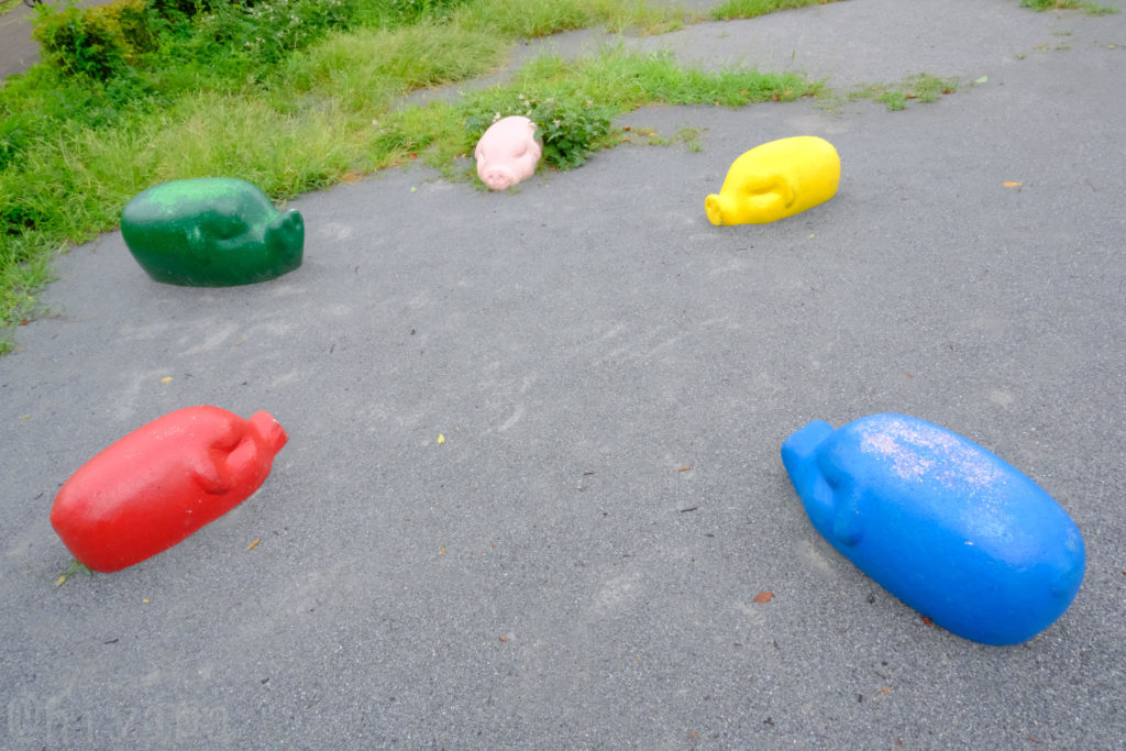 それは2019年のこと。散歩道をくっちゃべりながら歩く我らの前に突如彼らは現れた。敷地のはしのほうで3匹、円を描くでも一直線に並ぶでもない絶妙な配置で、思い思いのほうを向いてすやすやとしているぶたの象形遊具だった。3匹もいるのに全員寝ていて、知り合いくらいのほどよい距離感でまとまっている。なぜみんな寝ているのか? なぜぶたなのか? なぜ中途半端な配置なのか? なぜ少し地面にめりこんでいるのか? 疑問は尽きない。初見の置きものに、ただただセンスと狂気を感じるのみ。