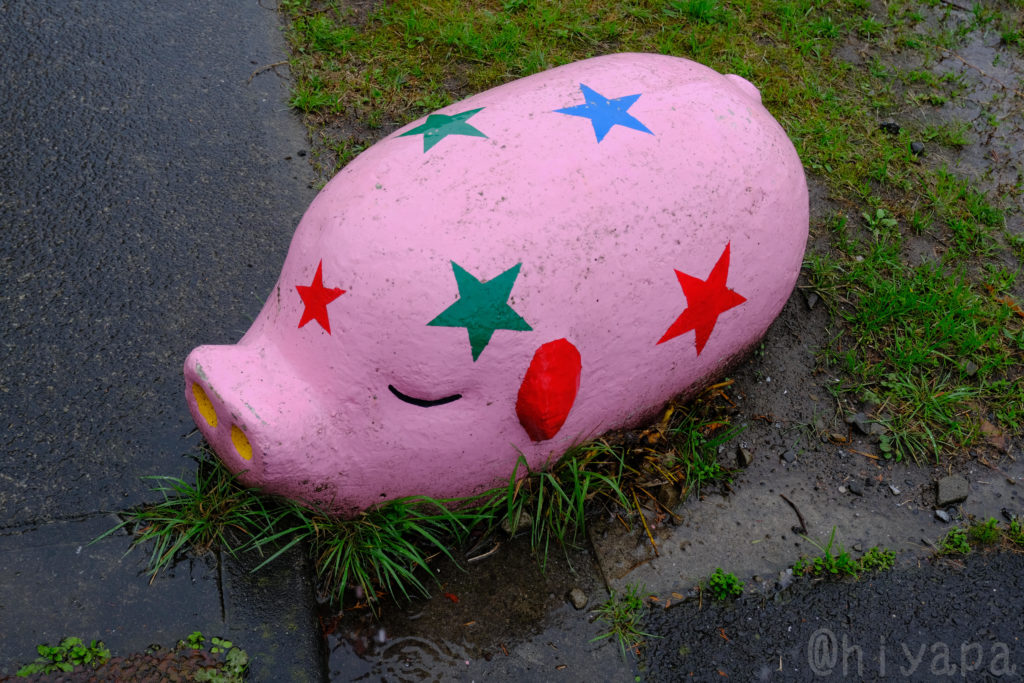 何匹か見ていくうちに、いくつかわかってきた。まず、大きさが3種類ある。ちび、ノーマル、でかくて長いの。3種類目は大中小、とセットにするには長すぎる、インパクトのあるサイズだった。初期はこのでかぶたを発見しては狂気、もとい恐怖を感じていた。夜に見ると重量感抜群でそこそこに怖かった。そしてどのぶたも製造過程や経年劣化による個体差はあるものの、同じ規格だった。お尻にはくるんとひと巻きしたしっぽ、ほんのり突起した耳、楕円の鼻に凹みが2つ、アイデンティティの穏やかな眠り顔。たまに漫画的表現で瞼にあたる部分を眼球扱いして白塗られ、真ん中に黒目を置かれて開眼している子もいた。カラリングはぶたらしく肌色・薄ピンクが多いわけでもなく、ビビッドから石本来の色までバラエティ豊か。開眼以外にも星や水玉の模様でデコられたり、てんとう虫が這わせてあったりなど、ペイントの仕方で個性を競っていることもあった。それと、仲間がいた。かめやうさぎ、かえる、うま、りす、きりんたちだ。彼らは暗渠――かつての水路を指す――を活用した緑道公園や、団地内の公園によくいる。ぶた同様にこぞって同じ規格、思い思いの方向へ顔をやっている。かめ、かえる、ぞうに関しては2パターンのデザインがあったが、3パターンなのはぶたのみだったし、信じられないことに寝ているのもぶたオンリィだった。どこの会社様がフランチャイザ、つまり権利や設計図をお持ちなのだろう。どうやらこんな公園にいる動物たちをアニマルライド、と括ることも知った。