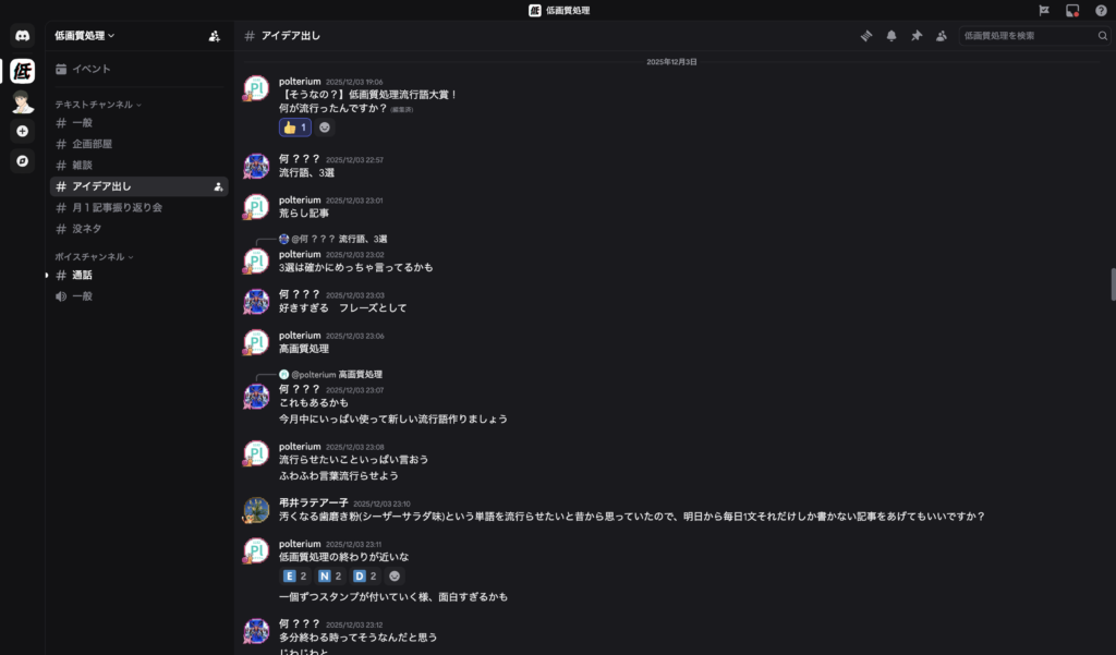Discord 部門からは、”高画質処理”、”サツエンド”、”Hなサイト” の三つがノミネートされました。