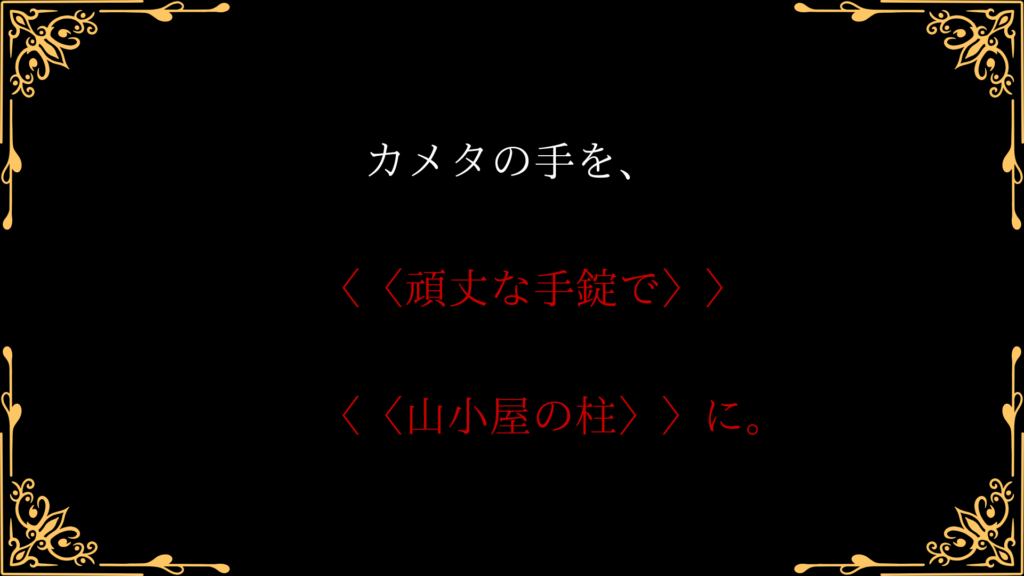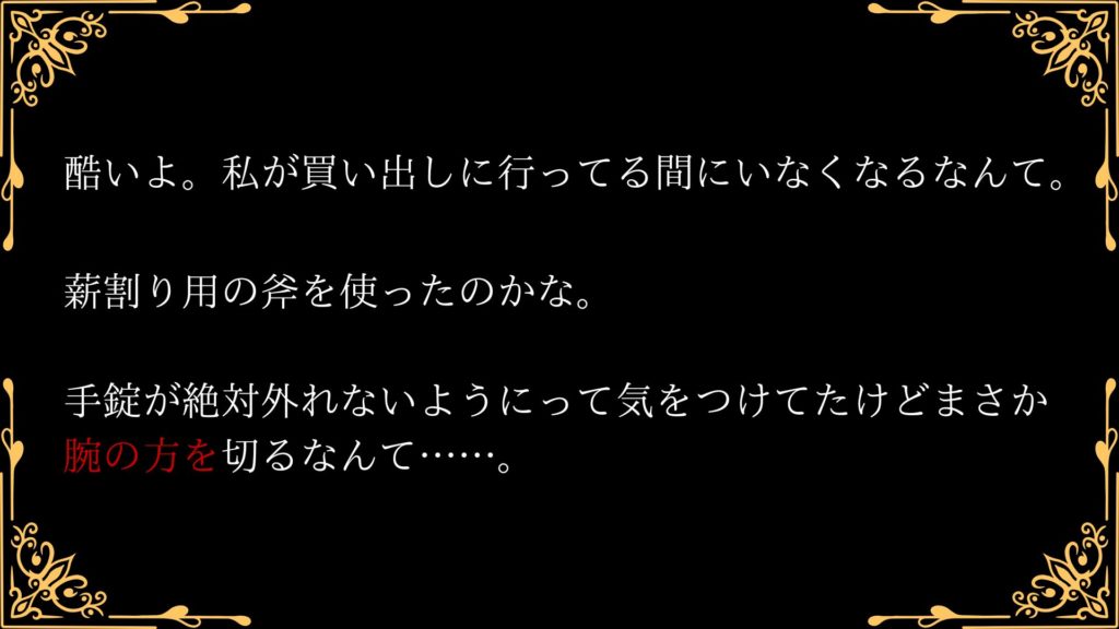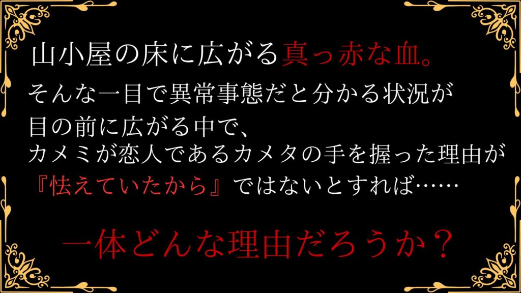 このままじゃたどり着かないだろうから言うけど、「監禁されてるのはカメタ」ってのと「カメタが自分で自分の腕を切った」ってのは合ってるし。