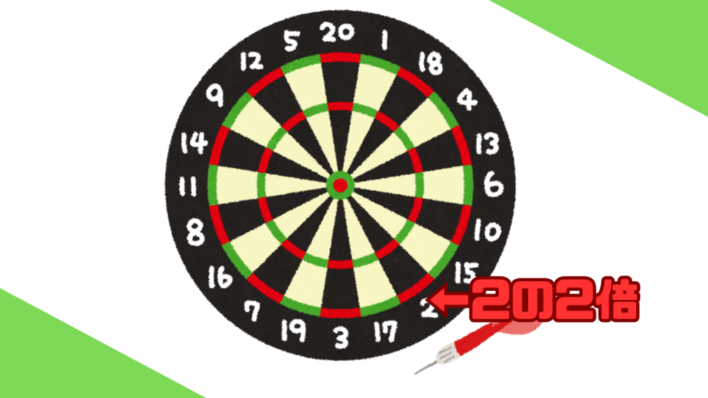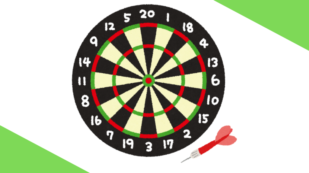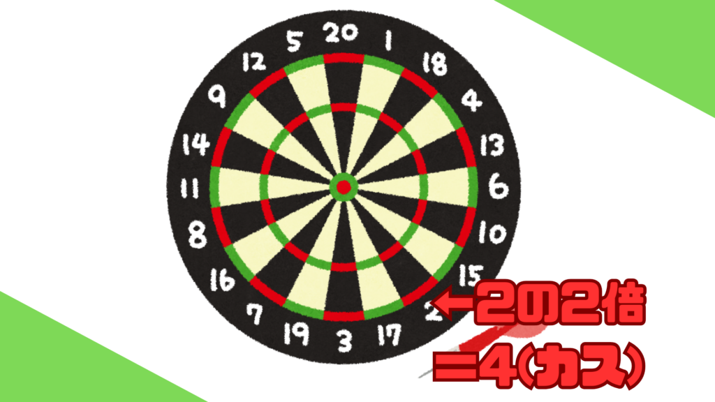 広いとこはボードに書いてるそのままの点数なんだけど、外周の狭いところに入れたら通常の2倍、内のところに入れたら3倍の点になるのよ。