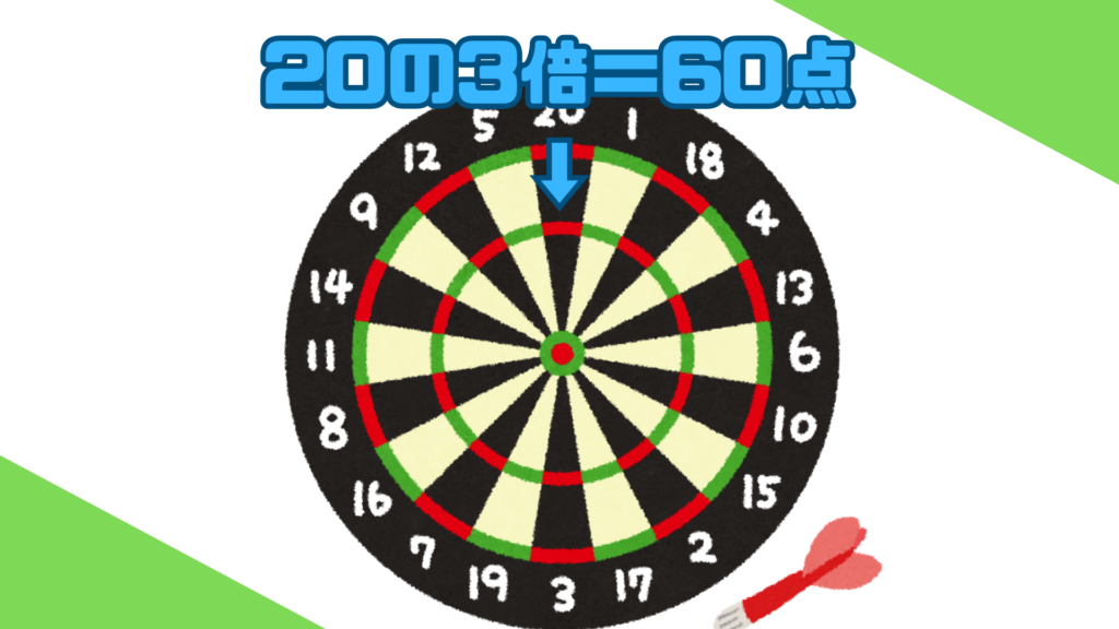 例えばここに当てると、「20の3倍」で60点が取れる、「20のトリプル」になる。ちなみに真ん中(ブル)に当てても50点だから、ここに当てるのがカウントアップでは一番良いとされてる。