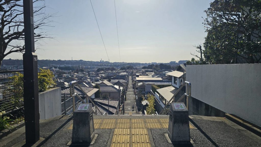 坂道を歩いていくと、聖蹟桜ヶ丘駅周辺が見渡せます。