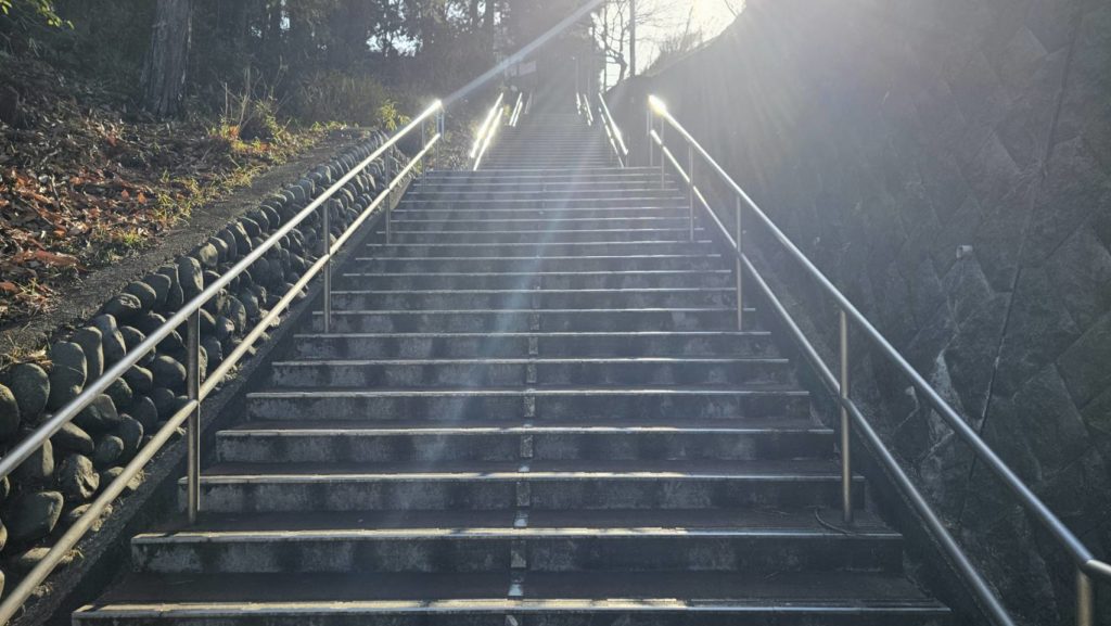 階段の多さを撮ろうと思ったのですが、逆光で天国への階段みたいになりました。
