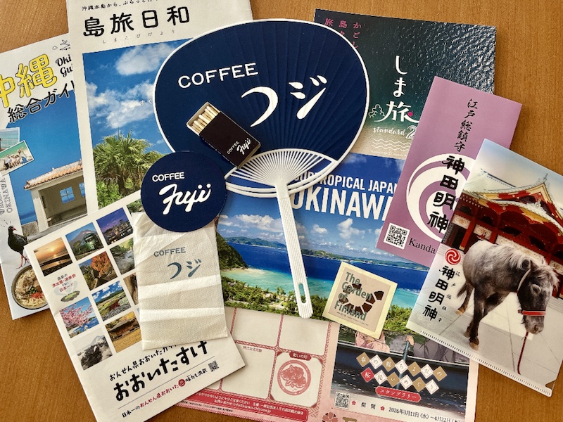 神田明神の御朱印、千代田区の「マンホールカード」を配布している観光案内所に置いてあった旅行パンフレット、お花見スタンプラリーの台紙など。