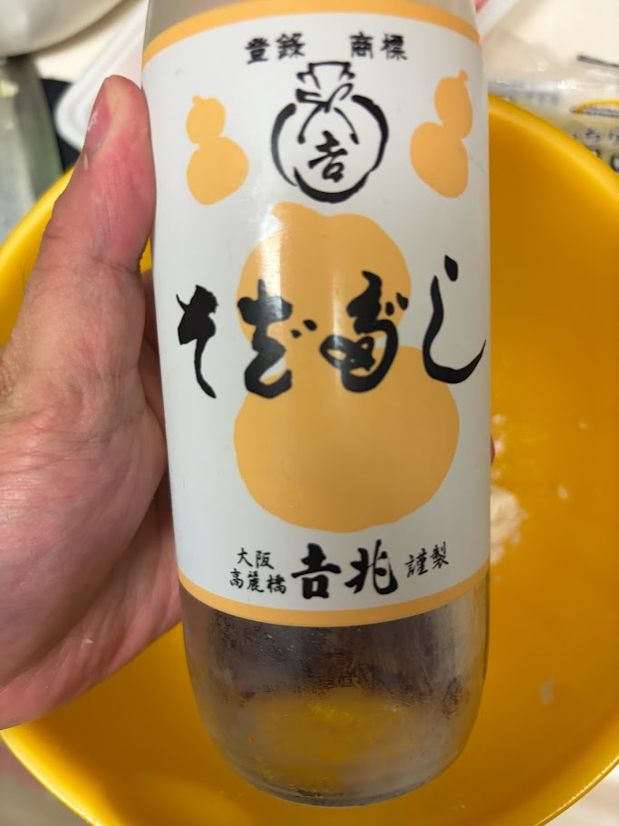 だしの味をさせるためにめんつゆを入れた。もらい物のちょっと良いめんつゆだ。なんて書いてあるかわからないけど、おいしいからOKだ。